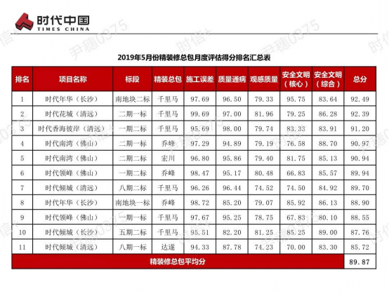 時代中國成立于1999年,是在香港上市的總部位于廣州的知名開發(fā)商。時代中國一直深耕珠三角,輻射全面,年銷售額今年計劃超千億!對品質(zhì)要求非常高!對安全文明施工、實(shí)測實(shí)量、交付評估、售后服務(wù)都非常重視。專門聘請在業(yè)內(nèi)非常嚴(yán)格的第三方評估公司——深圳市瑞捷建筑工程咨詢有限公司,對項目整個過程進(jìn)行評估與監(jiān)督。 深圳千里馬裝飾集團(tuán)本著“專業(yè)鑄造精品,服務(wù)提升價值”的精神,把客戶放在第一位,認(rèn)認(rèn)真真抓落實(shí)、認(rèn)真落實(shí)客戶指令。緊抓“工匠精神”不動搖,施工質(zhì)量和現(xiàn)場安全文明施工逐步提升。 作為時代中國的精裝修戰(zhàn)略合作供應(yīng)商,我司項目包攬時代中國2019年5月月度評估前三名!可喜可賀,只要我們重視、認(rèn)真,取得好成績應(yīng)是理所當(dāng)然!恭喜獲得好成績的項目小伙伴,感謝獲得好成績的小伙伴,你們?yōu)楣救〉昧藰s譽(yù),公司全體同事以你們?yōu)榘粒? 千里馬裝飾集團(tuán)實(shí)行“奮斗者文化”,急招有志之士加盟千里馬,你的奮斗和付出將會獲得公司巨大的支持以及豐厚的回報。 深圳千里馬裝飾集團(tuán)人力資源部,電話號碼:0755-26756366,千里馬裝飾期待您的加入。