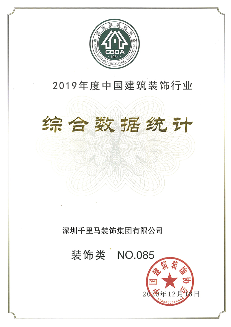 2020年12月23日上午,2019年度中國建筑裝飾行業數據綜合統計排名發布會在深圳隆重召開,深圳千里馬裝飾集團憑借綜合實力榮登全國排名第85名。再登百強榜單,充分展示了業界對深圳千里馬裝飾集團在裝飾領域綜合實力的高度認可。